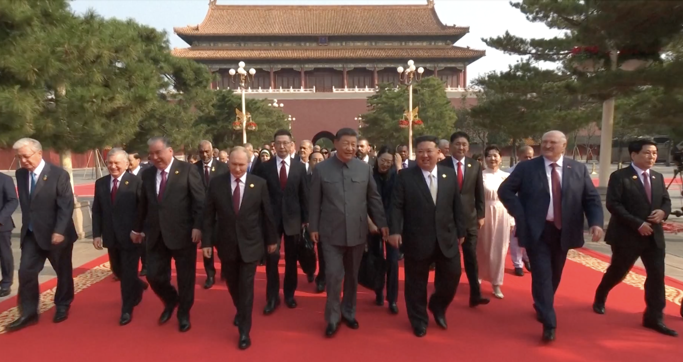習近平與嘉賓在天安門城樓前大合照,其後一同走上城樓的觀禮台。中俄朝領袖並肩走在最前面,習近平在中間,普京及金正恩在兩邊,三人不時談天。習近平又與嘉賓在觀禮台,與出席觀看閱兵的抗戰老兵握手,向他們表示崇高敬意。