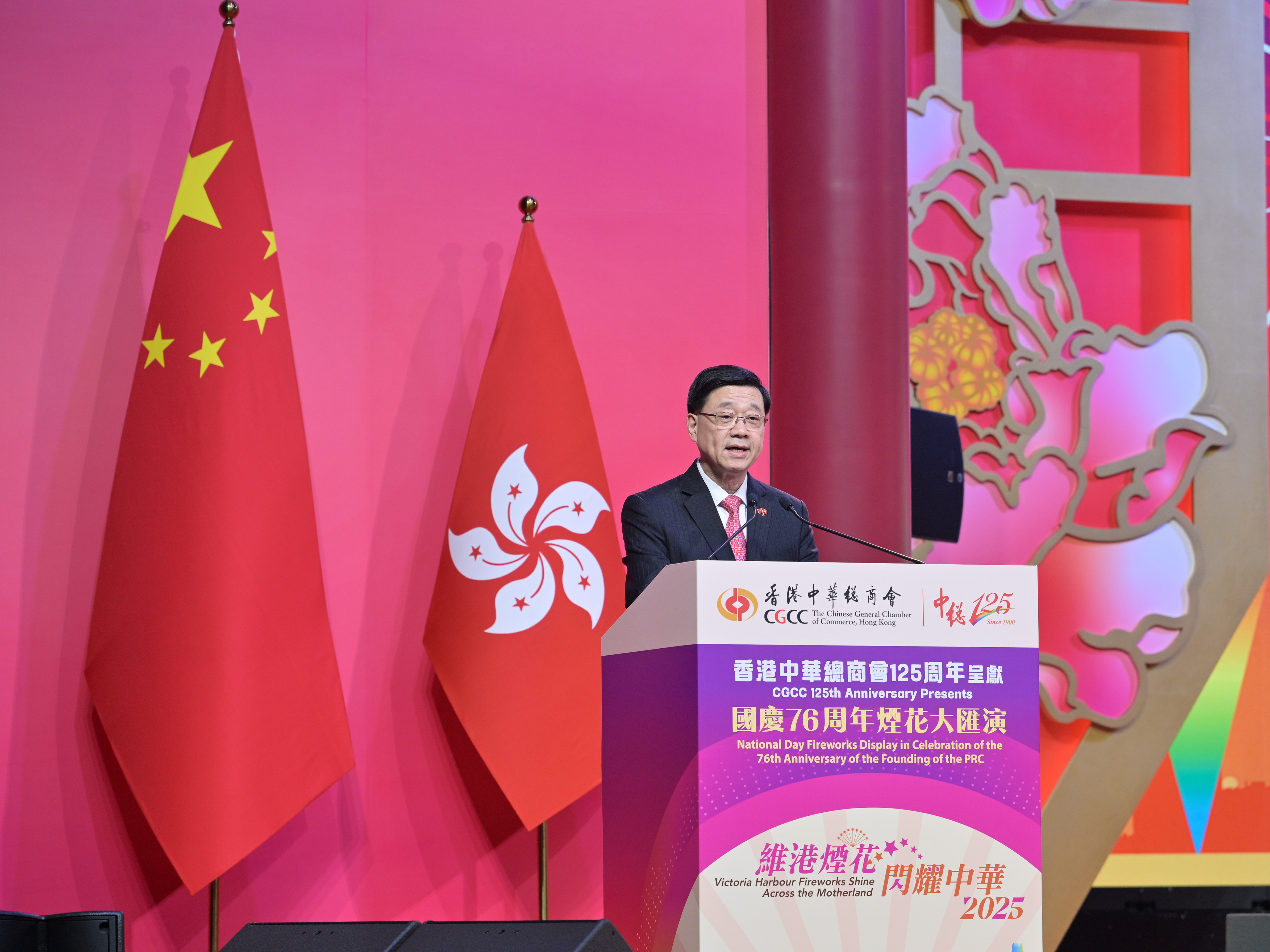 行政長官李家超在致辭時祝願國家繁榮昌盛,香港續創輝煌。李家超表示很高興和市民一起慶祝中華人民共和國成立76周年,指76載砥礪前行,全國人民團結奮鬥,國家發展成就舉世矚目,創造經濟快速發展和社會長期穩定的兩大奇蹟,令每一位中華兒女都感到振奮、自豪、驕傲。他又提到下月將迎來首次由粵港澳三地共同承辦的第十五屆全國運動會,充分彰顯國家對香港舉辦大型體育盛事能力的信任、對香港體育發展的支持。