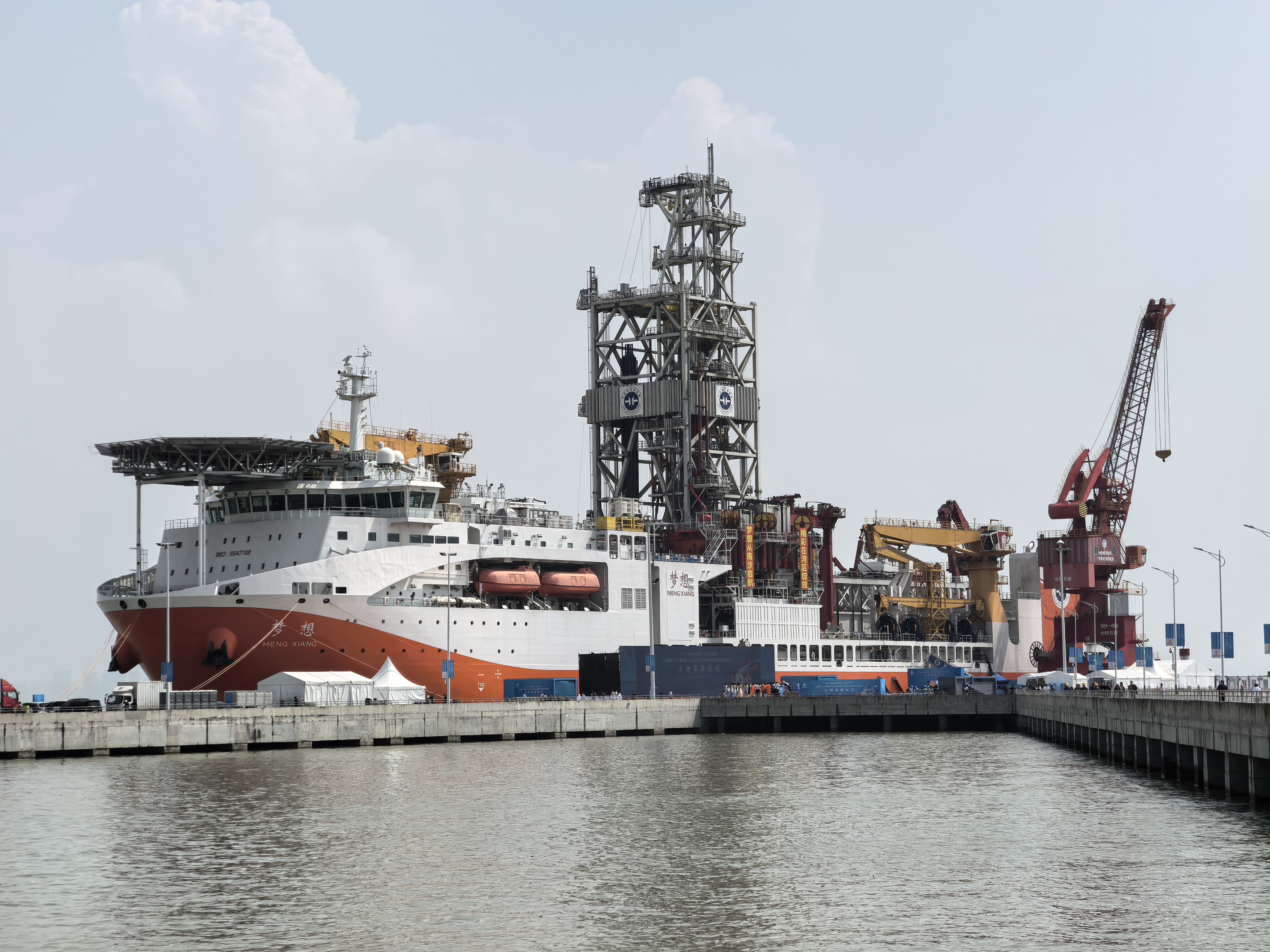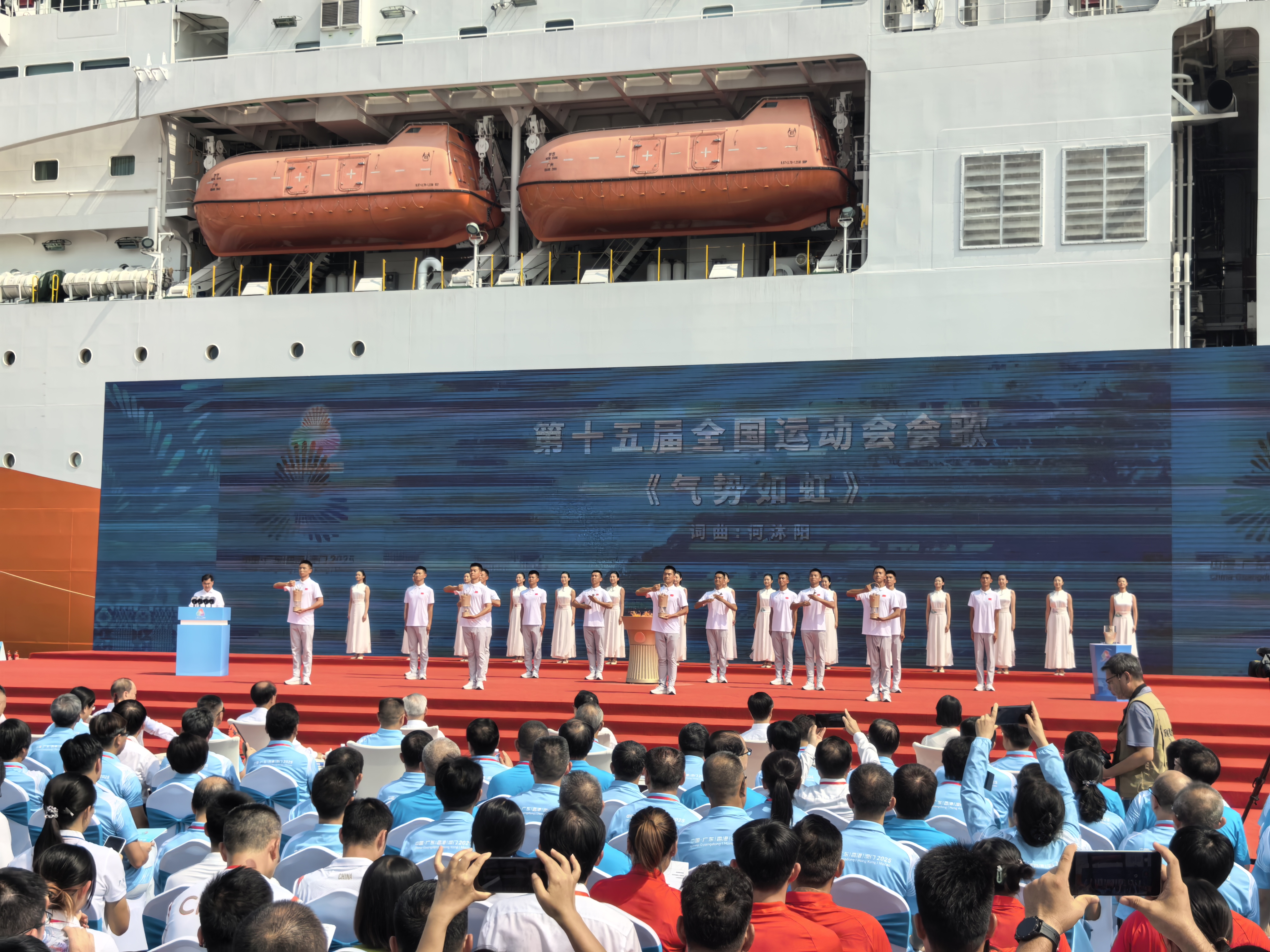 火種採集儀式現場,停靠著由中國自主設計建造的首艘大洋鑽探船「夢想」號。船長179.8米,寬32.8米,排水量42600噸,續航力15000海里,全球海域無限航區,可在6級海況下正常作業、16級超強颱風下安全生存,堪稱海上移動的「國家實驗室」。而此次十五運會的聖火「源火」就是靠它護送回來。