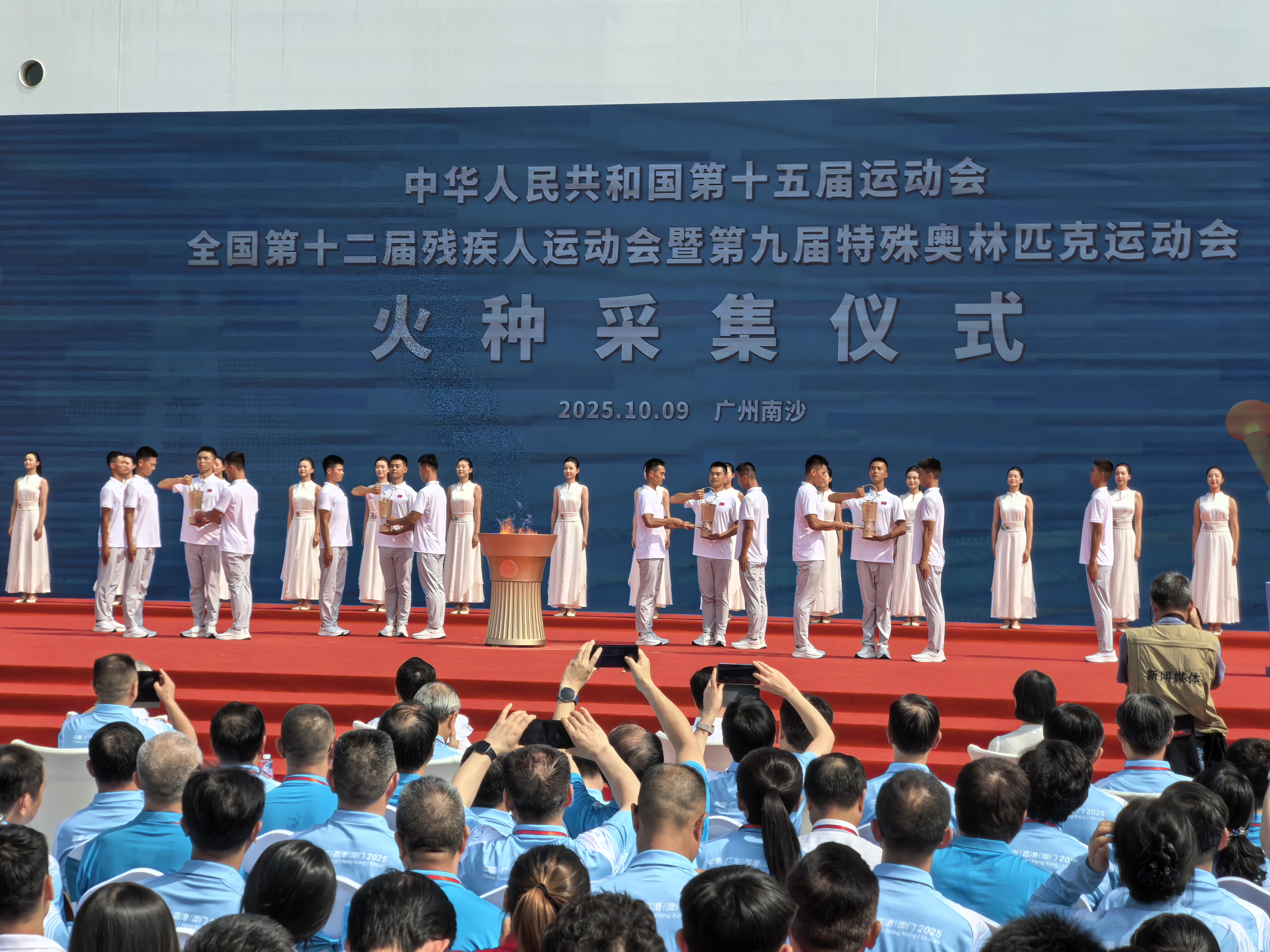 第十五屆全國運動會和全國第十二屆殘疾人運動會暨第九屆特殊奧林匹克運動會火種採集儀式,昨日(9日)在廣州市南沙區的廣州海洋地質調查局科考碼頭舉行。