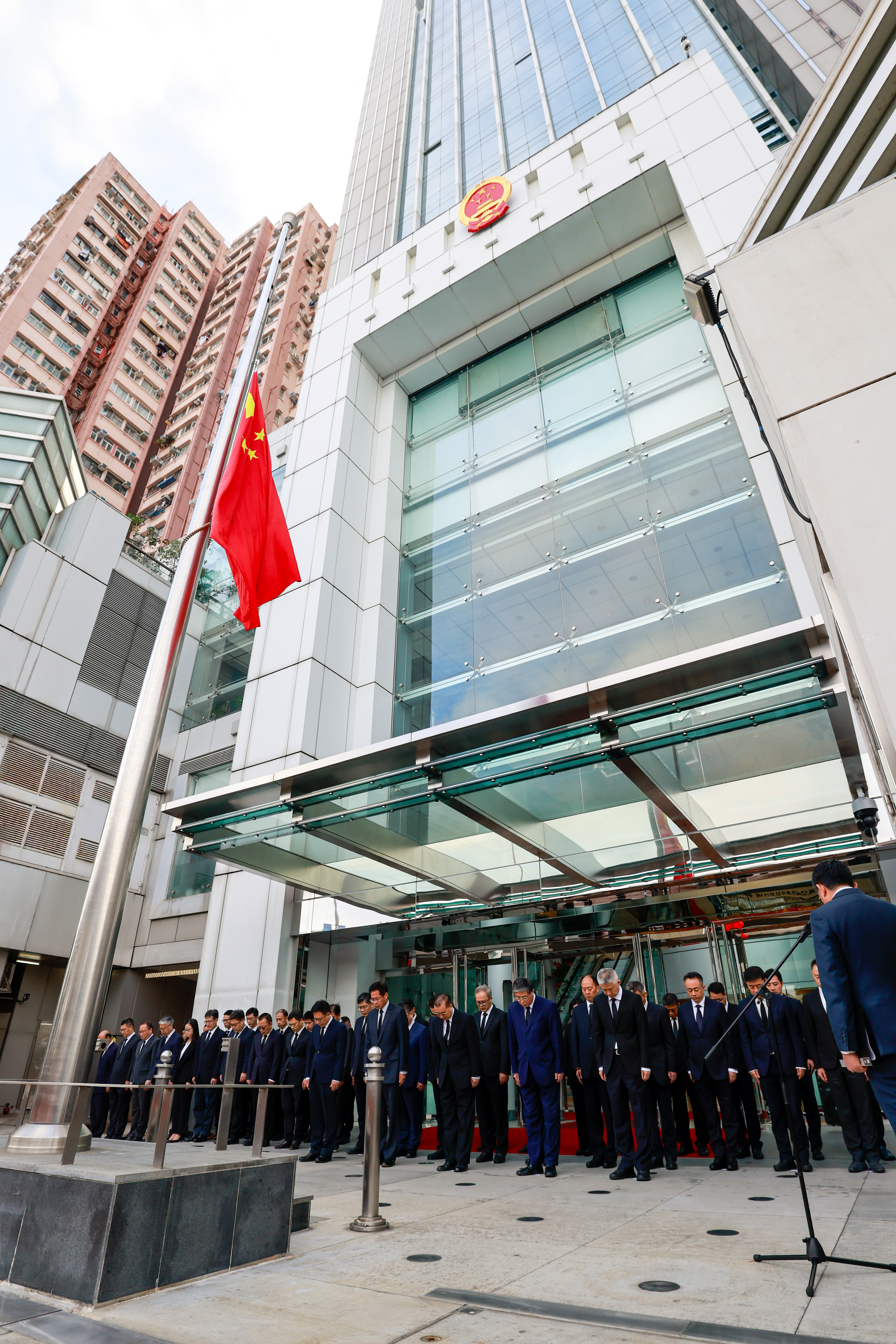 上午8時,中聯辦副主任劉光源、羅永綱、祁斌、孫尚武和秘書長王松苗,在港協助開展救災工作的中央港澳辦工作小組成員,中聯辦幹部職工代表,在辦公樓前肅立。國旗升到旗桿頂部後,再徐徐降半旗。全體人員默哀3分鐘,表達對火災中不幸罹難人士的沉痛哀悼和英勇犧牲消防員的崇高敬意。