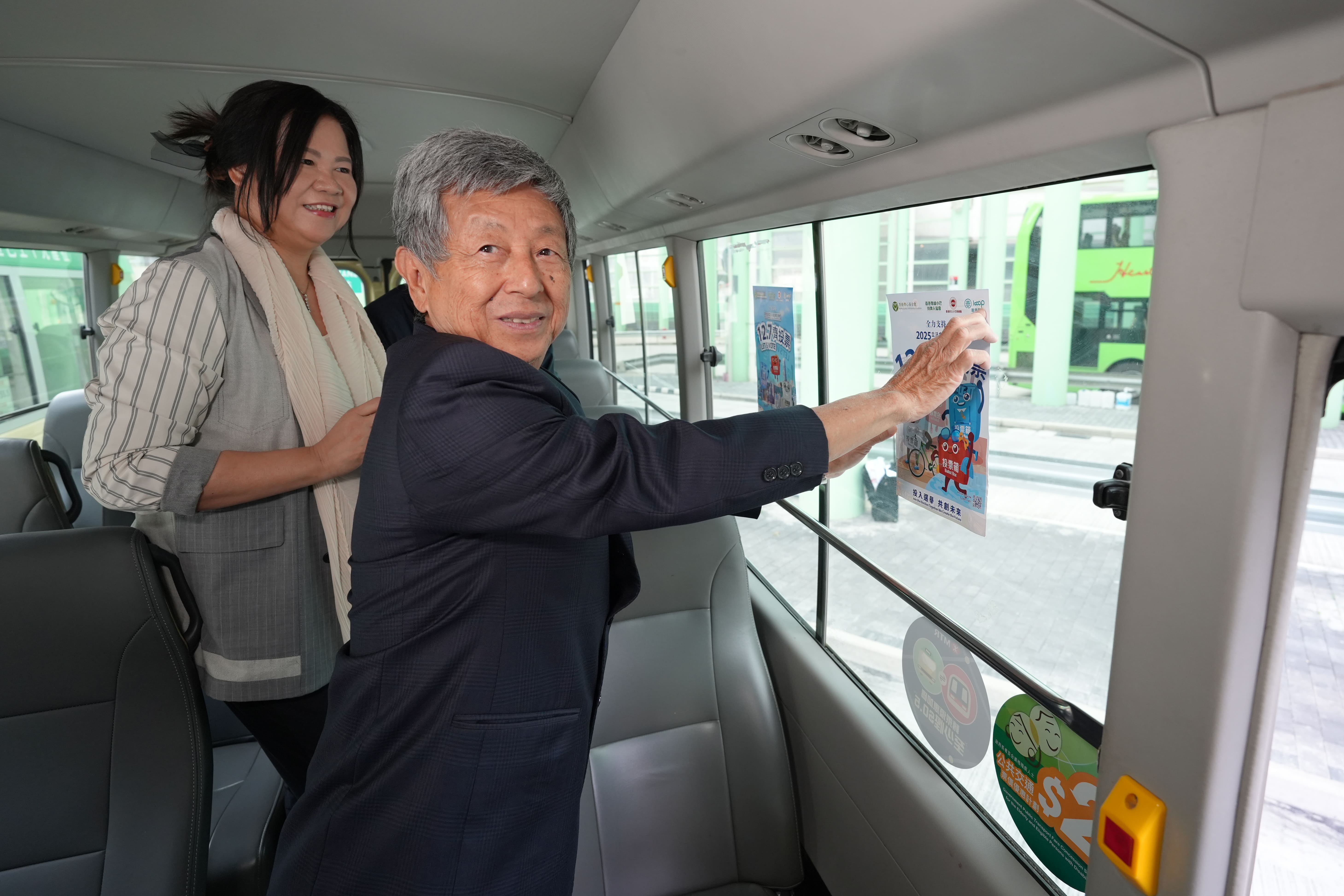 香港齊心基金會執行董事及圈傳媒總社長張瑞蓮為小巴貼上海報