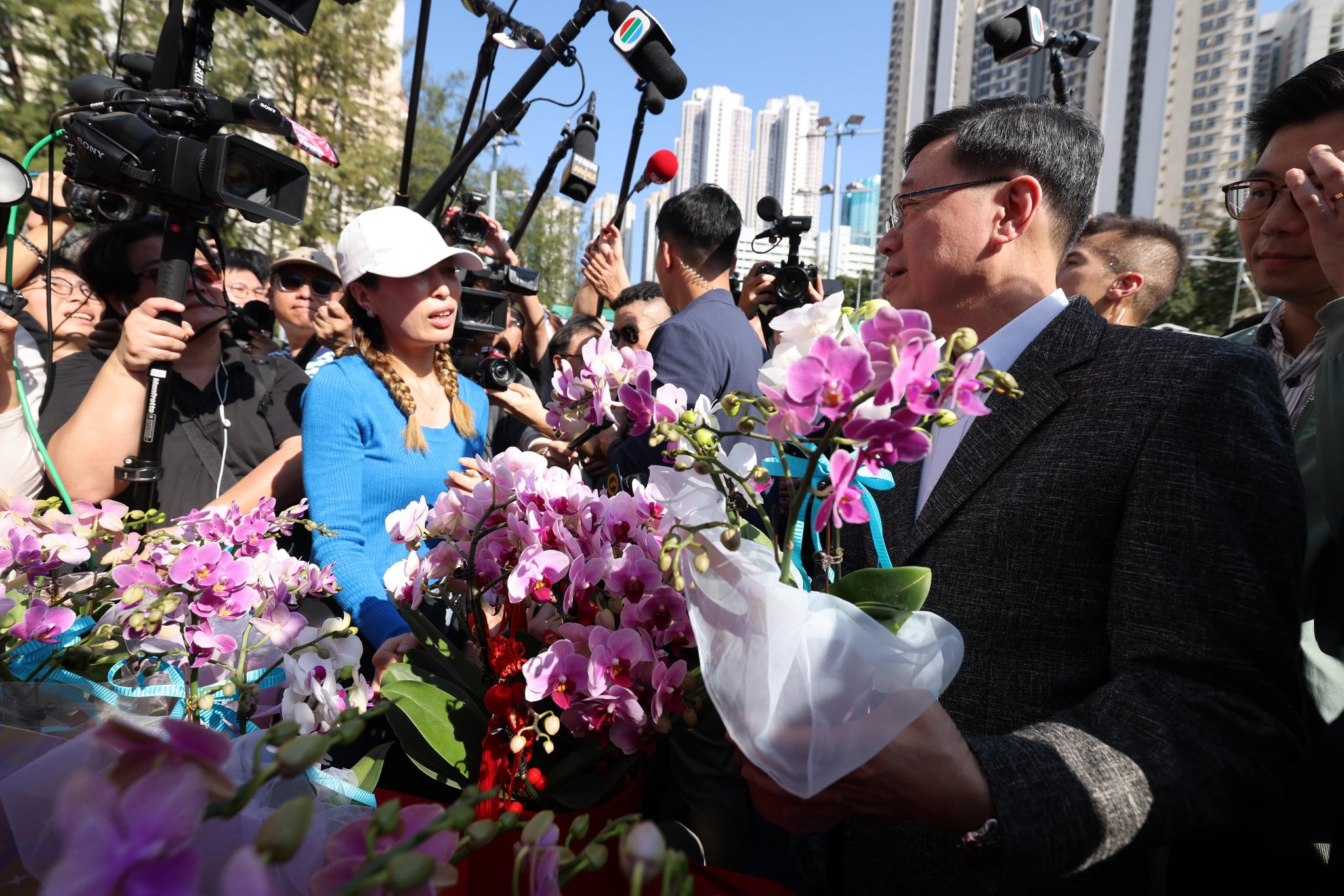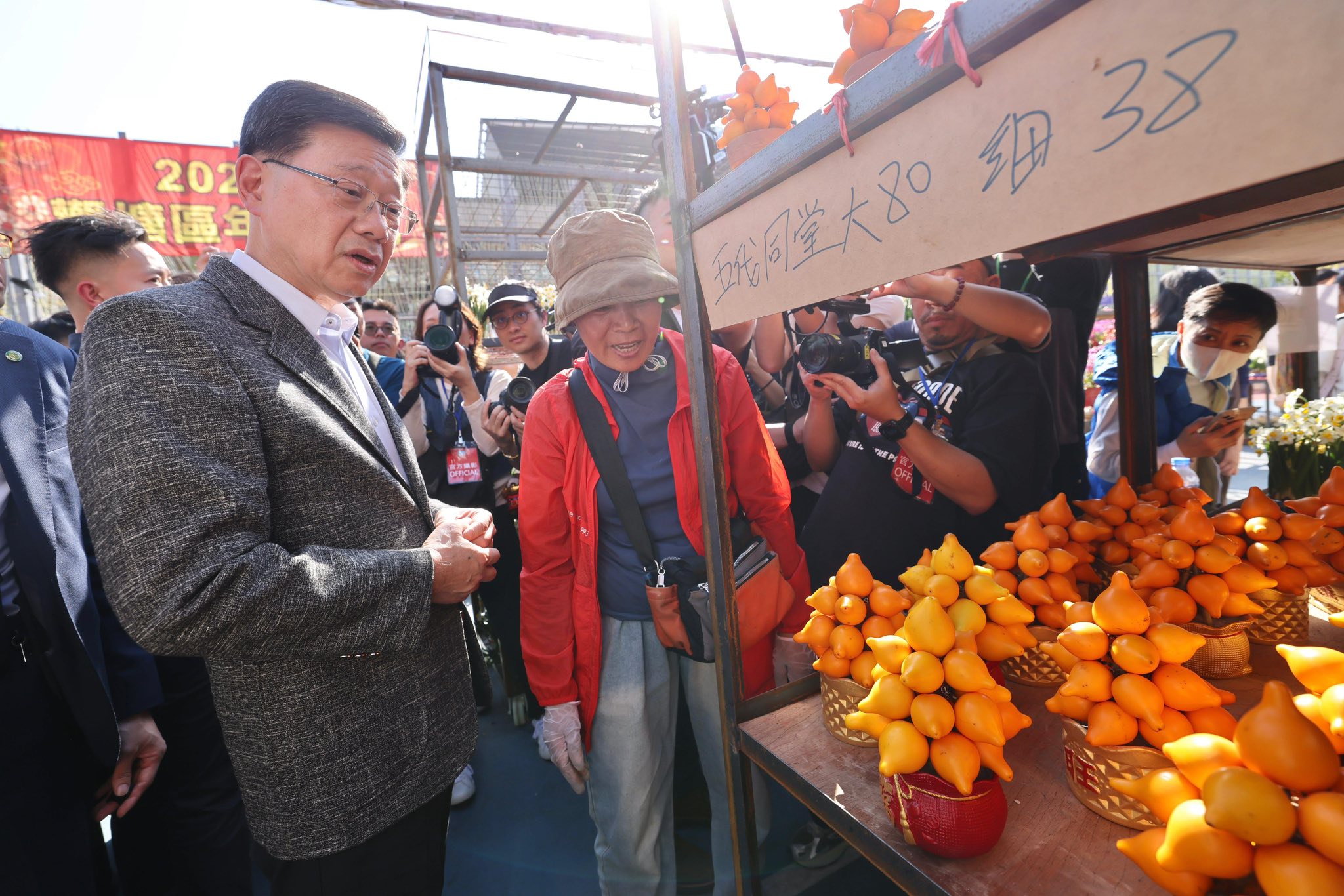今日(16日)年廿九大除夕,行政長官李家超下午聯同民政及青年事務局局長麥美娟、環境及生態局局長謝展寰等官員,到觀塘遊樂場年宵市場逛花市,表示希望了解年宵市場情況和新年氣氛。他在逛花市期間,鼓勵擺攤檔的學生參與青年工作,又與多名市民傾談。