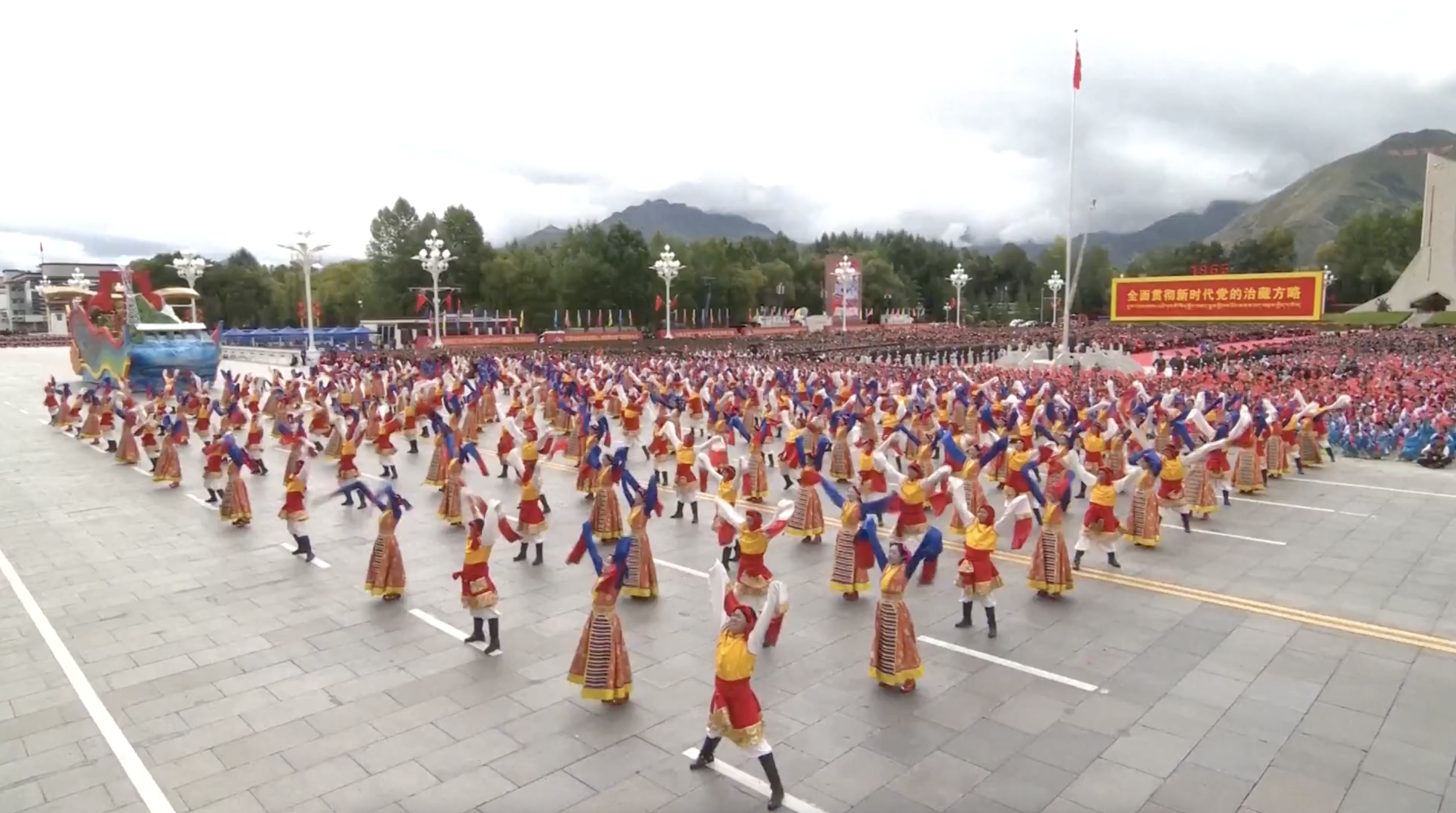 演員們伴隨著節奏的變化,在廣場上「開」出一片格桑花海。隊形變換,組成同心圓造型,向自治區生日獻上祝福,也寓意著各族兒女像石榴籽一樣緊緊抱在一起,共同建設現代化新西藏。