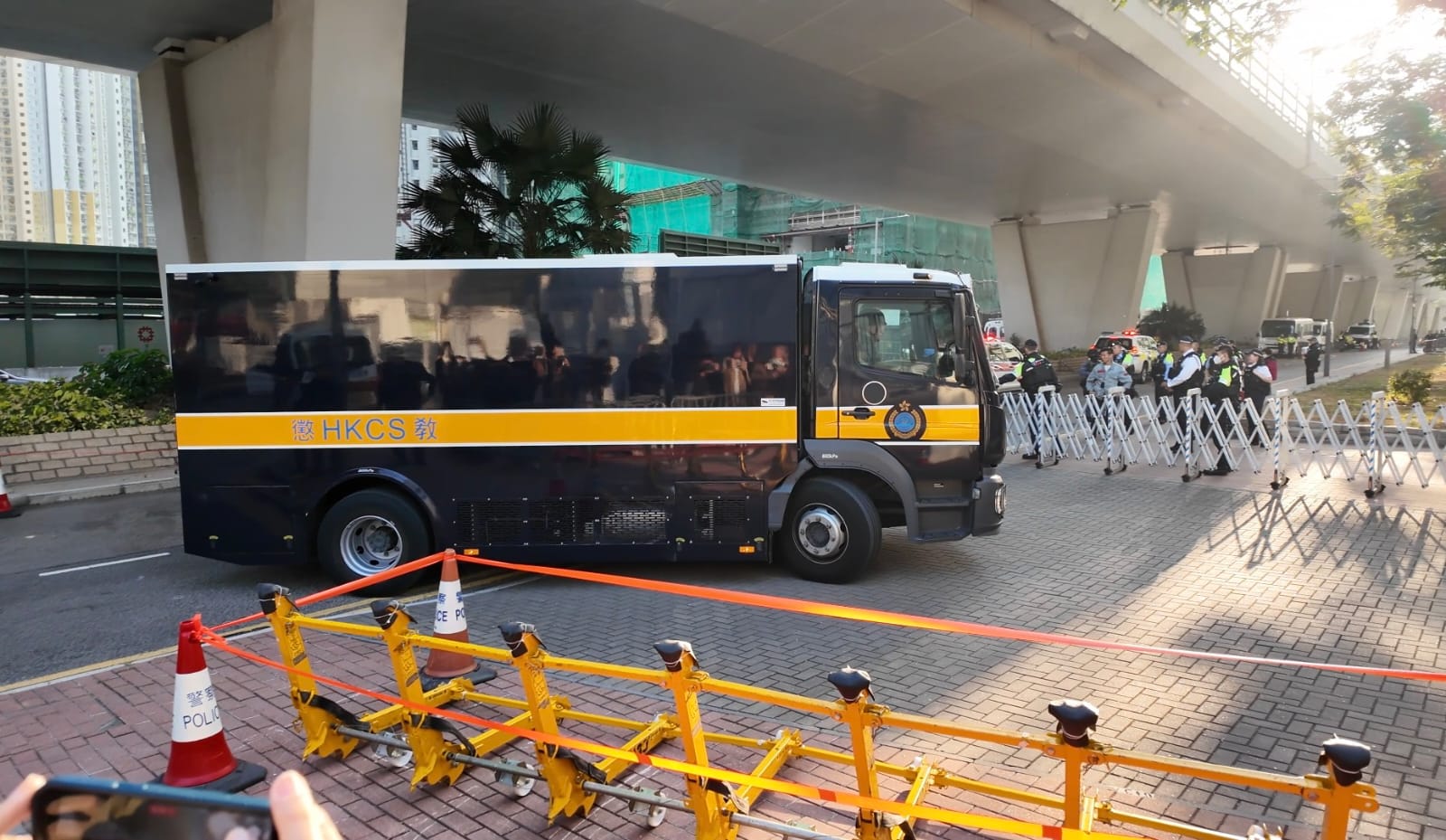 黎智英身穿米黃色外套、戴黑色粗框眼鏡,向親友抱拳、合十及揮手打招呼。